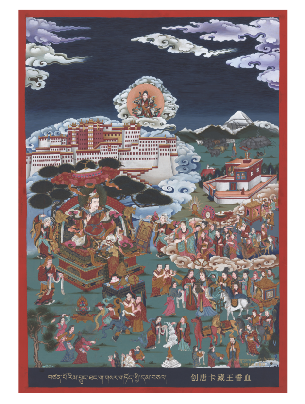 《创唐卡藏王誓血》描绘了唐卡的起源。7世纪中叶,尼泊尔赤尊公主和唐朝文成公主相继和亲吐蕃,嫁给吐蕃王朝的33任赞普——藏王松赞干布(617—650年)。当时的吐蕃,在松赞干布统一西藏,施行奴隶制度后,吐蕃王朝达到了前所未有的鼎盛。两位公主入藏,将佛教引入藏区,为佛教在藏区的兴盛起到重要作用。其入藏之时,除陪嫁的金银珠宝、能工巧匠外都携带释迦等身金佛像。