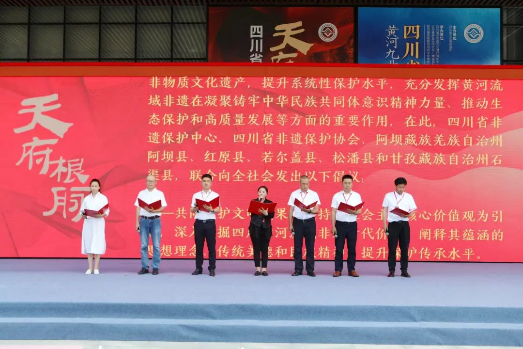 在开幕仪式上,省非遗保护中心、省非遗保护协会、阿坝县、若尔盖县、红原县、松潘县、石渠县共同发布《四川省黄河流域非遗保护倡议书》。