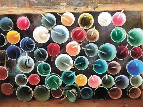 加工藏族矿植物绘画颜料的方法很天然,沉淀之后颜色自然分开,为了将不同的颜色彻底分离,有时候需要搅拌,再继续沉淀。